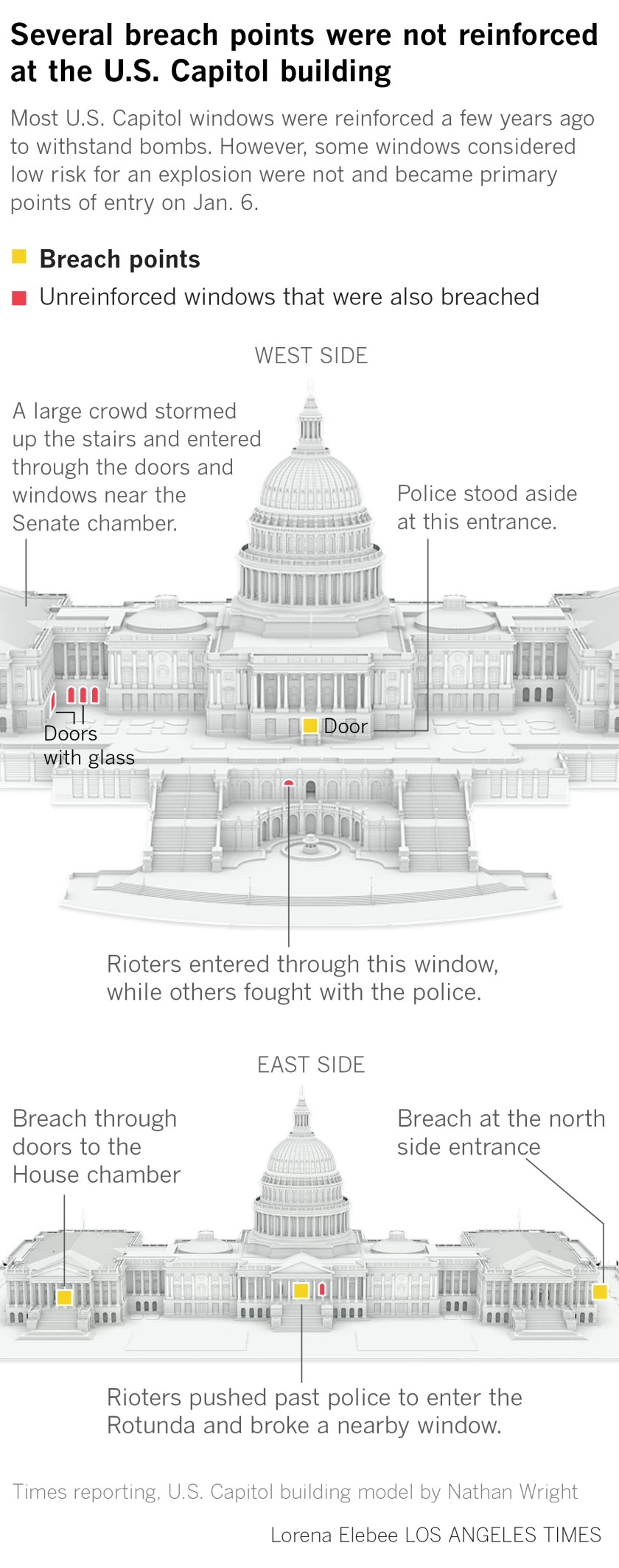 - Video shows some of the first rioters to break through the police line running past 15 reinforced windows, making a beeline for a recessed area on the Senate side of the building, where two unreinforced windows and two doors with unreinforced glass were all that stood between them and hallways leading to lawmakers inside who had not begun to evacuate.